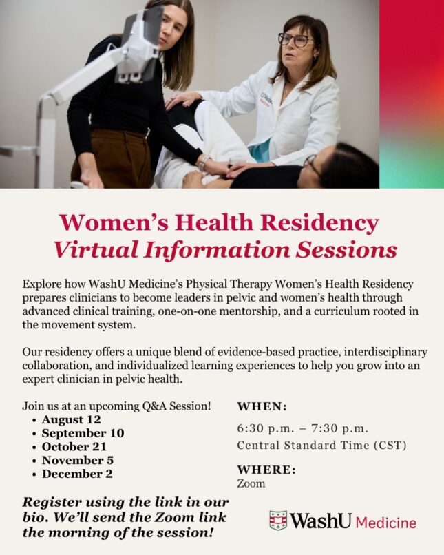 Women’s Health Residency Virtual Information Session Dec 02, 2025 6:30 p.m.-7:30 p.m. Misc. Events Add to: Google Calendar | Outlook | iCal File Register here: : https://wustl.az1.qualtrics.com/jfe/form/SV_1AeK1WKRLOicw5g Zoom links will be sent the day of the session.